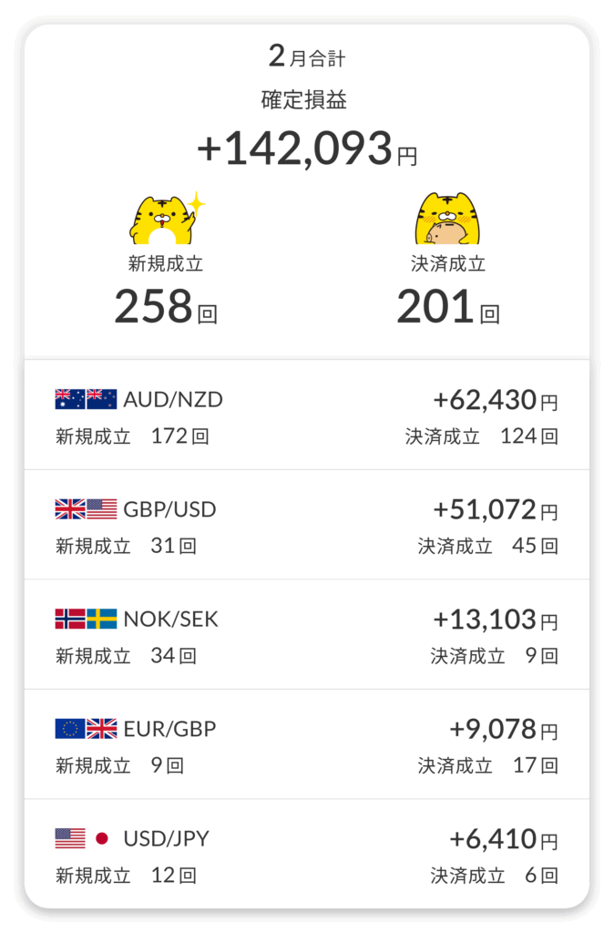 2月は値幅が細りつつも、往復の小刻みな回転で利確が積み上がりました。両国の利下げ通過後もボラは限定的で、売り方向はスワップが逆風になりやすい局面です。玉を盛り過ぎず密度を均し、評価損の膨張を抑える運用に徹しました。ニュース次第で変動が強まる可能性を見込みつつ、レンジ内の継続回転で対応します。